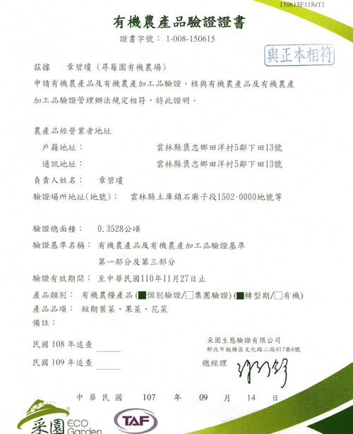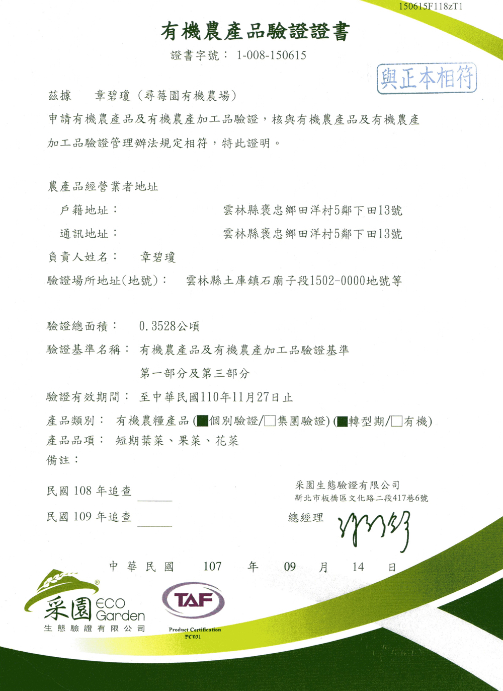 因為喜歡吃草莓,於是,開始研究草莓。早期用高架種植草莓,現在則採用土耕的方式種植。經過不斷的學習、改良和實驗,種出一顆顆健康飽滿又香氣十足的紅寶石。尋莓園有機農場致力於生產安全、優質、健康、營養的農產品,讓消費者吃得安心零負擔,一直是我們的堅持!
